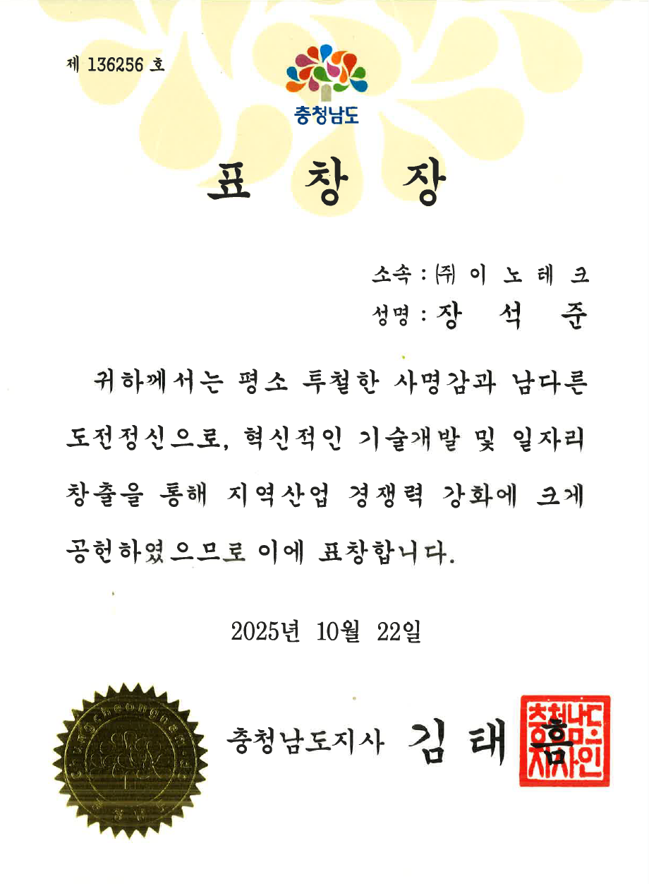 충청남도지사 표창장[충남우수기업인 표창]